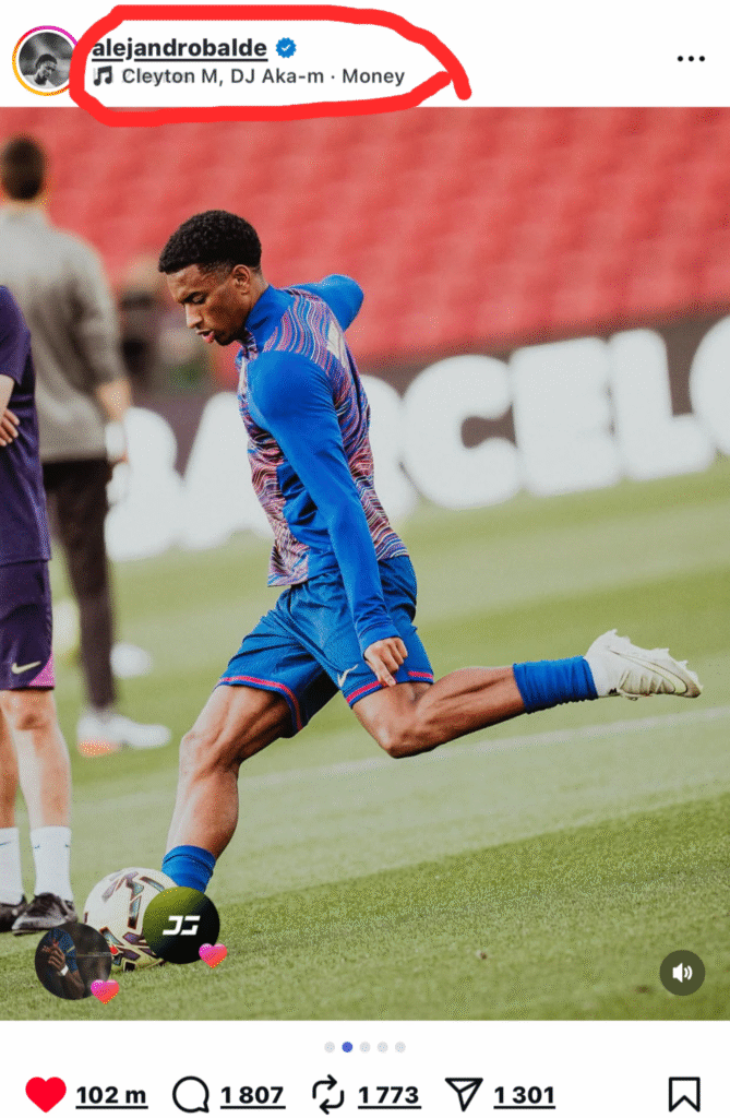 Na sequência da vitória do Barcelona sobre o Alavés, o defesa Alejandro Balde aproveitou as redes sociais para uma celebração repleta de significado cultural. O jovem jogador não só partilhou imagens da sua atuação em campo, como escolheu como banda sonora o sucesso “Money”, do artista angolano Cleyton M, que continua a dominar as plataformas digitais com a sua coreografia viral.