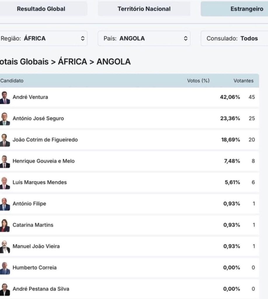 Cerca de 42% dos cidadãos portugueses residentes em Angola escolheram André Ventura, que liderou a votação no país nas eleições presidenciais realizadas ontem, 18 de janeiro de 2026. No total, Ventura obteve 42,06% dos votos, correspondentes a 45 eleitores.