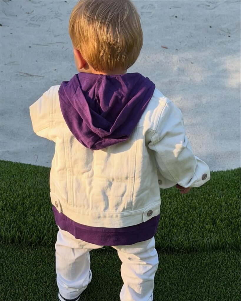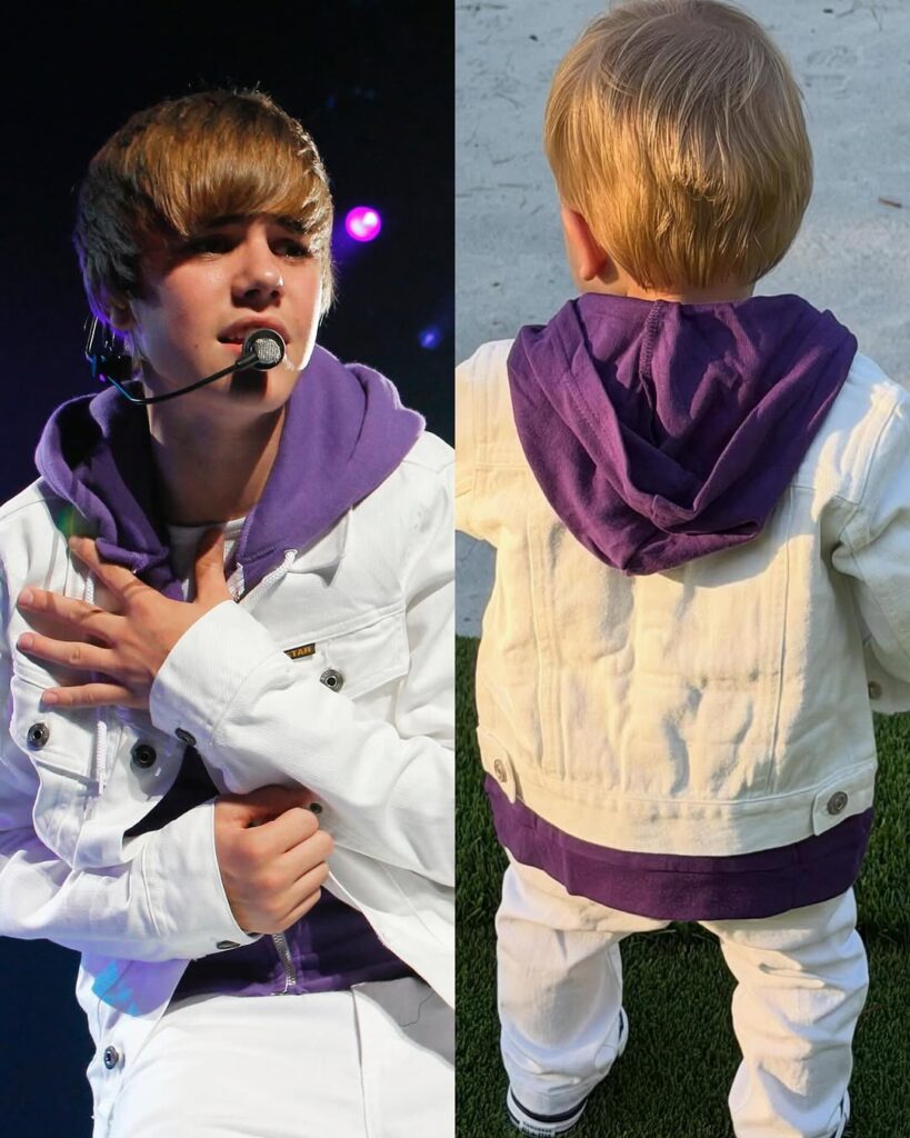 O look escolhido é uma recriação fiel do icónico visual que marcou a fase “Baby” de Justin Bieber: casaco e calças brancas combinados com o famoso hoodie roxo que o cantor usou em várias atuações no início da década de 2010.