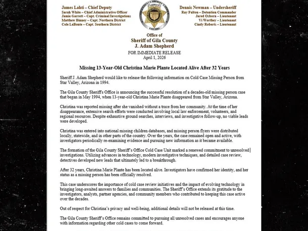 Christina Marie Plante, uma adolescente de 13 anos que desapareceu em 1994, foi encontrada viva após 32 anos! Ela foi vista pela última vez saindo de casa para ir ao estábulo onde seu cavalo estava, em Star Valley, Arizona, e nunca mais foi vista.