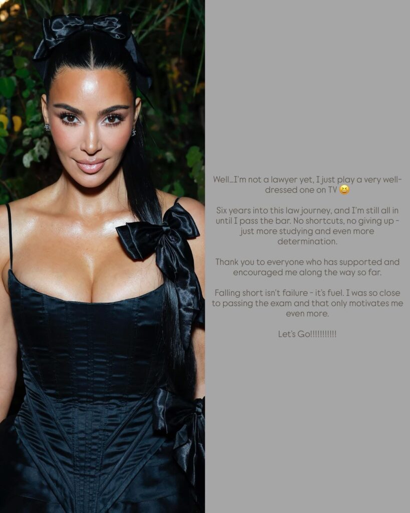 Kardashian assegurou que estar perto de conseguir a aprovação funcionou como um incentivo. “Não atingir o objetivo não é um fracasso – é um combustível. Estive muito perto de passar no exame e isso só me motiva ainda mais”, afirmou, agradecendo o apoio recebido durante a longa jornada.