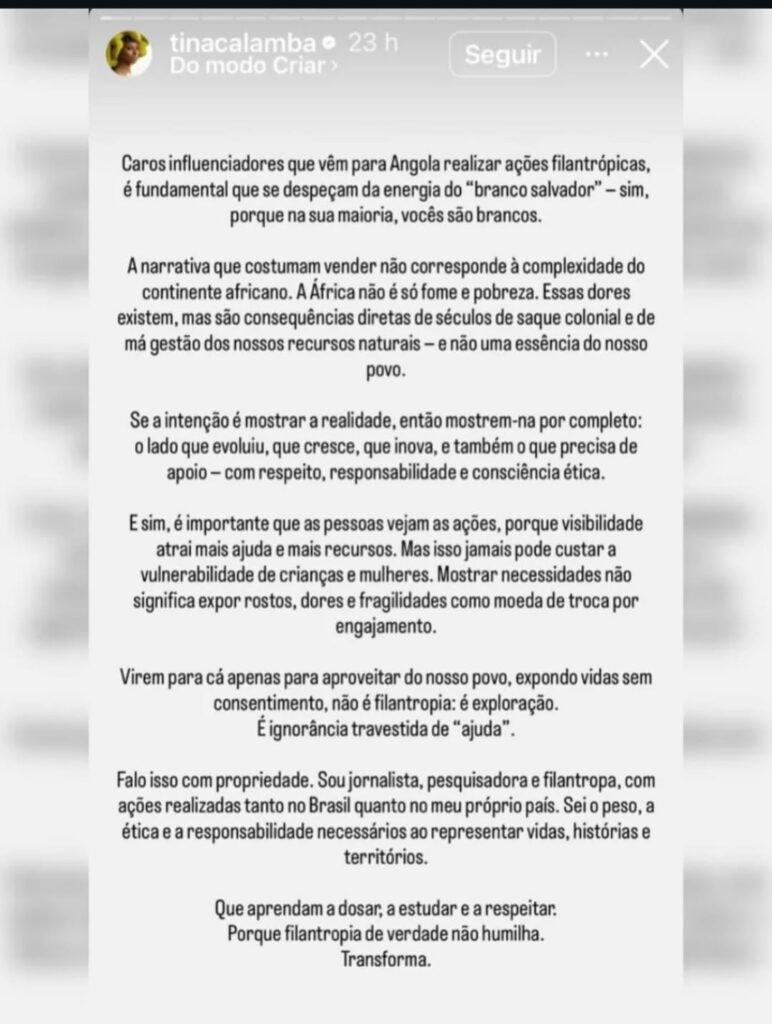 A ex-BBB também criticou as práticas que exploram a imagem e a dignidade do povo angolano sem consentimento, afirmando que “Virem para cá apenas para aproveitar do nosso povo, expondo vidas sem consentimento, não é filantropia: é exploração”.